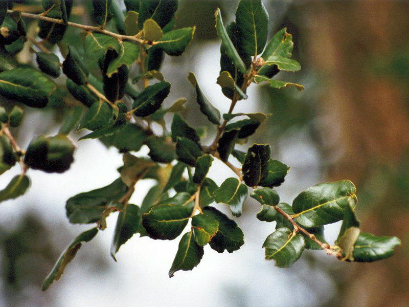 Steineichen. Sie sind an ihren ledrigen, dunkelgrünen Blättern leicht zu