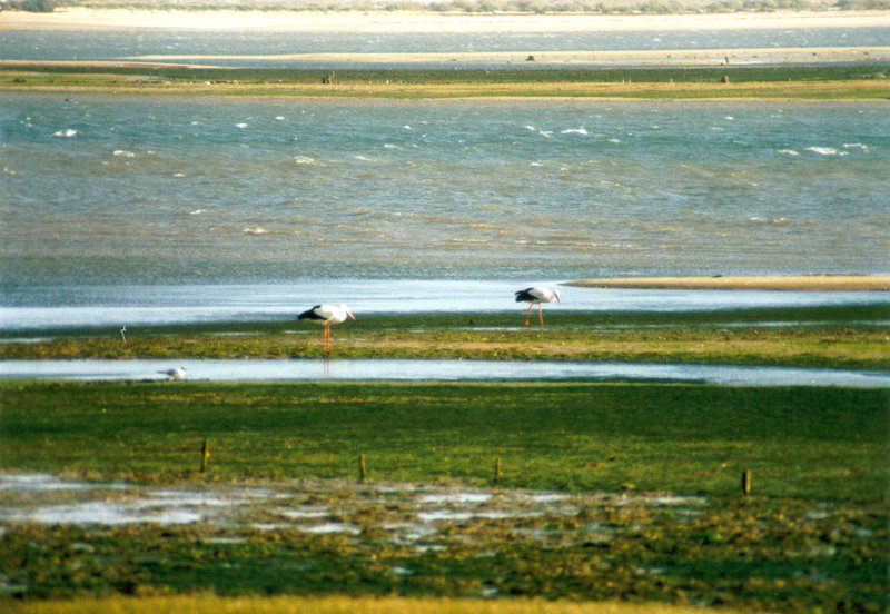 Nahrungssuche haben sich die Störche auf die Salzwiesen oder in den