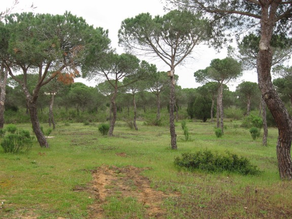 Wanderung führt durch eine offene Landschaft mit Pinien und Gebüschen,