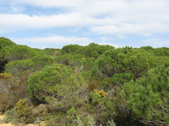 sondern im gesamten Mittelmeerraum kommt die Pinie vor. Foto: 28.03.2009, Nähe Matalascañas