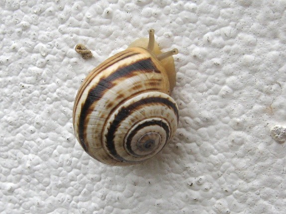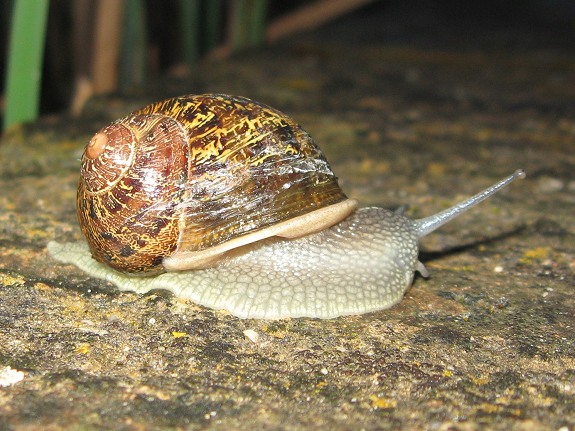 Grundfarbe der Gefleckten Weinbergschnecke ist meist ein recht dunkles
