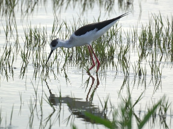 Stelzenläufer in vergleichsweise tiefem Wasser waten und nach Nahrung