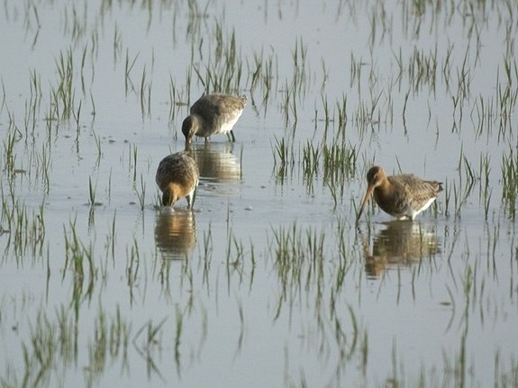 Schnabel stochern die Vögel im Wasser nach Nahrung. Sie ernähren sich
