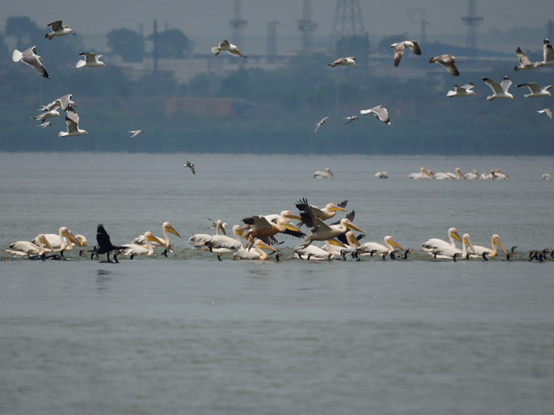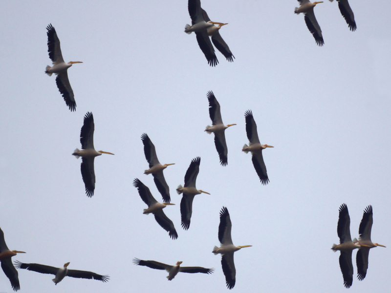 Rosapelikan (Great White Pelican, Pelecanus onocrotalus) Der Rosapelikan ist mit seiner Körpergröße von 1,6 Meter und seiner Flügelspannweite von bis zu 2,8 Meter einer der größten Vögel, die man in Bulgarien beobachten kann. Das Gefieder dieser Vögel ist weiß gefärbt, im Brutkleid ist es teils rosa. Die langen Federn an den Flügeln sind schwarz, was man vor allem dann gut sieht, wenn die Rosapelikane fliegen. Oft gleiten sie mit ausgebreiteten Schwingen in der Thermik, wobei gut zu erkennen ist, dass ihre Flügel relativ breit sind. Im Gesicht befindet sich rund um die Augen ein unbefiederter Bereich, der rosafarben bis fleischfarben ist. Der Oberschnabel ist bei den meisten Individuen rötlich gefärbt, der große Kehlsack am Unterschnabel ist gelb. Rosa sind die Beine dieser Vögel gefärbt. Auf dem Speiseplan der Rosapelikane stehen vor allem Fische. In Bulgarien lassen sich diese Vögel am Schwarzen Meer beobachten. Den Winter verbringen die Rosapelikane in Nordostafrika.