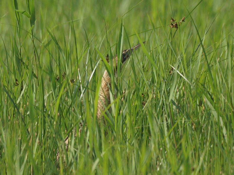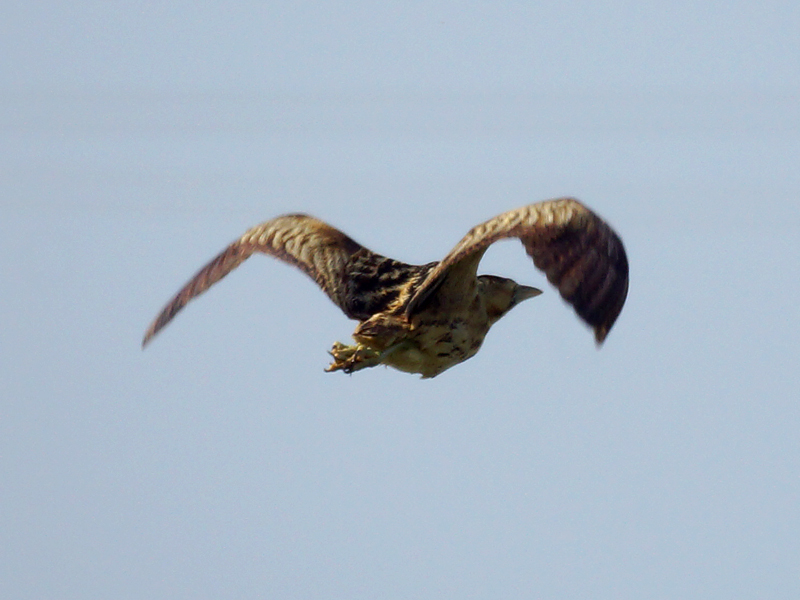 Rohrdommel (Great Bittern, Botaurus stellaris) In ausgedehnten, dichten Röhrichtbeständen ist die Rohrdommel heimisch. Diese Vögel sind zwischen 70 und 80 Zentimeter groß. Weibliche Rohrdommeln sind für gewöhnlich etwas zierlicher gebaut als die Männchen und wiegen durchschnittlich deutlich weniger als diese. Außerdem ist die Gefiederzeichnung der Männchen kräftiger als die ihrer Artgenossinnen. Rohrdommeln haben ein in unterschiedlichen Brauntönen gefärbtes Federkleid, das Reihen aus Flecken sowie Längsstreifen aufweist. Um mit ihrer Umgebung zu verschmelzen, verharren die Vögel häufig mit steil nach oben gestrecktem Schnabel. Diese Körperhaltung wird als Pfahlstellung bezeichnet. Einige Rohrdommeln verbringen den Winter im Süden, einige bleiben ihrem Brutgebiet treu, sofern die Gewässer dort nicht vollständig zufrieren. Verschiedene Tiere wie kleine Frösche, Fische und Wasserinsekten bilden die Nahrung dieser Vögel. Mitunter fressen sie zudem kleine Säuger und Kleinvögel, auch die Nester von Enten werden gelegentlich geplündert.