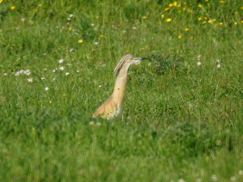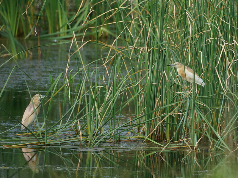 Rallenreiher (Squacco Heron, Ardeola ralloides) Zwischen 40 und 49 Zentimeter sind Rallenreiher groß. Halten sie sich am Boden auf, wirkt ihr meist Hals kurz und dick, weil sie ihn nur dann strecken, wenn sie neugierig oder alarmiert umher blicken. Auf der Oberseite des Körpers, am Kopf sowie am Hals und im Nacken sind die Federn ockerbraun gefärbt. Die Körperunterseite ist teils ockerbraun und teils weißlich. Der Schwanz und die Flügel sind weiß, was vor allem im Flug deutlich wird. Auf dem Kopf befinden sich im Brutkleid einige Streifen und die Vögel tragen verlängerte Federn, die bis in den Nacken fallen. Im Schlichtkleid ist der Schnabel am Grund gelblich, im Prachtkleid kann er bläulich sein. Orange bis rötlich sind die Beine und Füße gefärbt, bei jüngeren Rallenreihern sind sie gelblich. Beobachten lassen sich diese Vögel in Feuchtgebieten mit Ufervegetation oder Röhrichtzonen sowie in Süßwassersümpfen. Ihre tierische Nahrung, bestehend unter anderem aus kleinen Fischen, Amphibien und Krustentieren, erbeuten die Vögel in ihrem feuchten Lebensraum. Im Winter wandern die Vögel in den Süden ab. In Europa und auch in Bulgarien sind Rallenreiher selten. Insbesondere Bruten sind in Europa nur an einigen Stellen zu beobachten.