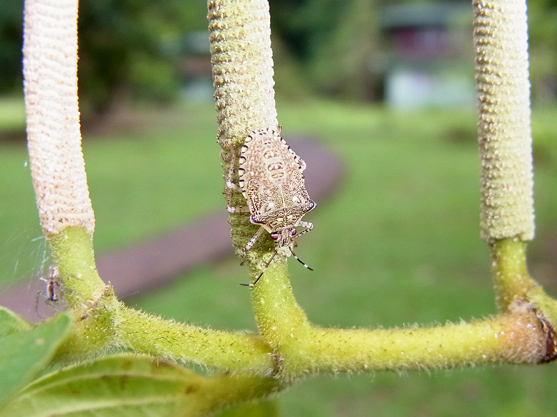 Mormidea ypsilon finden. Deshalb kann ich an dieser Stelle nur das von mir beobachtete Exemplar beschreiben. Circa neun bis zehn Millimeter betrug die Körperlänge des Tieres. Der Kopf dieser Tiere ist grünlich-bräunlich gefärbt und mit zahlreichen braunen Punktgruben bedeckt. Halsschild, Schildchen und der vordere Teil der Vorderflügel, die Halbdecken, sind braun. Sie tragen ebenfalls Punktgruben. An den Rändern ist das Schildchen weiß bis cremefarben, woraus sich eine y-förmige Struktur ergibt, auf die sich der wissenschaftliche Name bezieht. Außerdem befindet sich mittig knapp hinter dem Halsschild ein weißer Punkt, je ein weiterer lieg im hinteren Drittel der Halbdecken. Körper und Beine sind hellbraun bis grünlichbraun und tragen braune Flecken. Hell und dunkel gemustert sind die Fühler. Foto: 29.04.2012, Arenal-Nationalpark