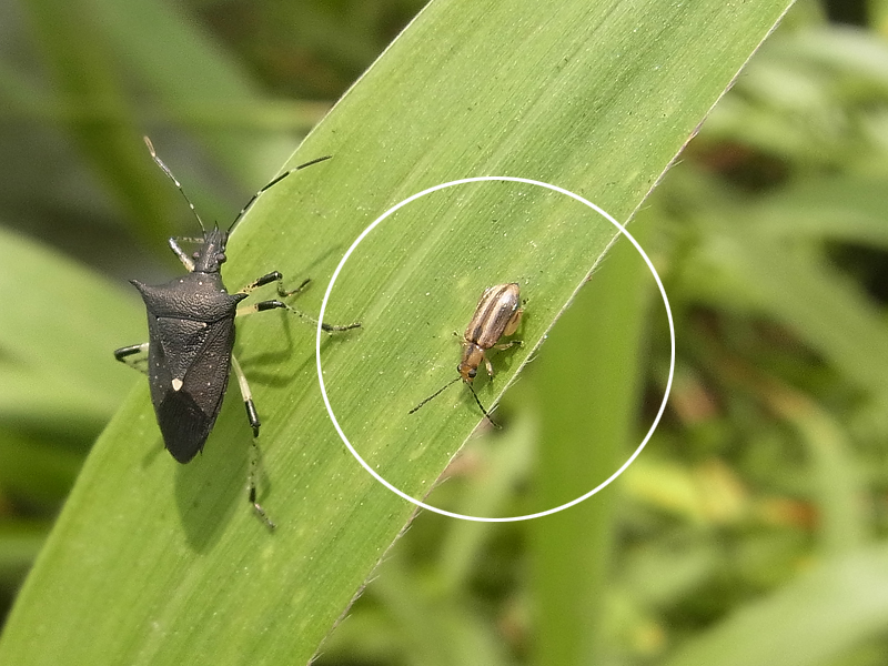 Nur etwa vier Millimeter sind diese Käfer lang. Die Art gehört zu den Blattkäfern (Chrysomelidae). Das auffälligste Merkmal von