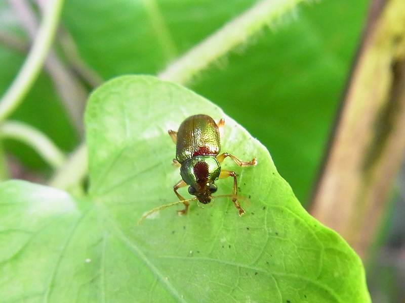 Omophita cyanipennis; bei dieser Spezies sind die Schenkel rötlich. Auf dem Speisezettel der kleinen Blattkäfer steht das Grün verschiedener Pflanzen. Ich konnte die Art im Tiefland Costa Ricas beobachten. Generell erstreckt sich ihr Verbreitungsgebiet von Guatemala bis nach Südamerika. Funde aus dem mittleren Bereich des Kontinents lassen vermuten, dass es bis nach Bolivien und Brasilien reicht. Foto: 05.05.2012, Nähe Manzanillo