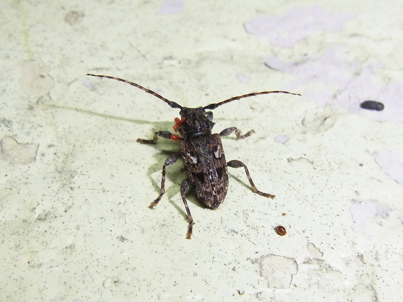 Omophoita aequinoctialis. Einen deutschen Trivialnamen hat sie meines Wissens nicht. Etwa vier bis fünf Millimeter sind diese hübschen Käfer lang. Ihr Körper zeigt eine dunkelbraune bis dunkelgraue Grundfärbung. Am schwarzen Kopf fällt ein weißlicher Bereich an der Stirn auf. Er liegt somit zwischen den beiden dunklen Facettenaugen. Für gewöhnlich sind die Fühler dunkelgrau. Rosa ist der Halsschild gefärbt. Schwarz ist die Grundfarbe der Flügeldecken, auf denen sich mehrere cremefarbene Flecken befinden. Die Schenkel des hinteren Beinpaares sind verdickt und dunkelgrau gefärbt. Dadurch unterscheidet sich die Art von