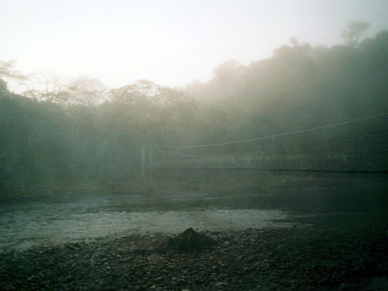 ihn überspannende Hängebrücke. Kurz vor Sonnenaufgang ist der Nebel noch