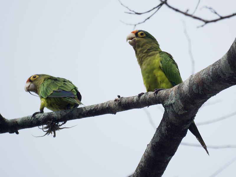Sehr gesellige Tiere sind die Elfenbeinsittiche. Man kann bei ihnen einen starken Zusammenhalt der Paare beobachten. Doch damit nicht genug, die Tiere schließen sich gern zu Gruppen zusammen, die zumeist zehn bis 20 Individuen umfassen. Rund 22,5 Zentimeter sind diese Papageien groß. Ihr Gefieder ist fast am gesamten Körper in unterschiedlichen Grünschattierungen gefärbt. Beide Geschlechter sehen gleich aus. Die Federn an der Stirn sind orangerot. Dahinter schließt sich am Oberkopf ein blauer Bereich an, der zum Nacken hin zusehends ins Grünliche verläuft. Rund um die Augen befindet sich ein cremefarbener nackter Hautbereich. Der Schnabel ist hornfarben, die Beine und Füße sind grau. Von Mexiko bis Costa Rica erstreckt sich das Verbreitungsgebiet dieser Vogelart. Elfenbeinsittiche kommen in Costa Rica im nördlichen pazifischen Tiefland sowie örtlich an den Hängen der Cordillera de Guanacaste und der Cordillera de Tilarán vor; außerdem leben sie in den Bergen der Nicoya-Halbinsel. Im Valle Central sind sie hingegen kaum präsent. Früchte, Samen und Blüten bilden die Nahrung dieser Sittiche; die Art wurde früher wissenschaftlich als