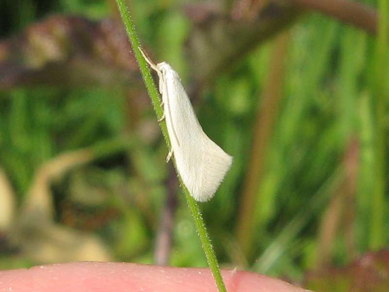 Grundfärbung der Vorderflügel ist grauweiß bis weiß, auch der Kopf und