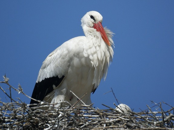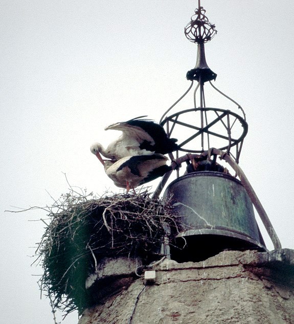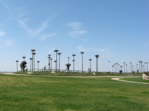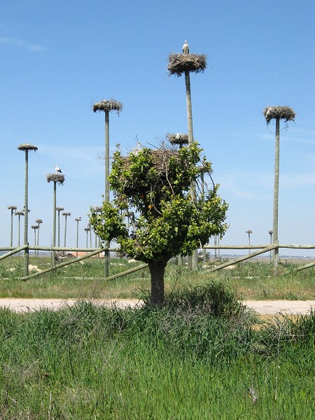 wenigen kleineren Bäumen rundherum gibt es zahllose Weißstorchennester. Die