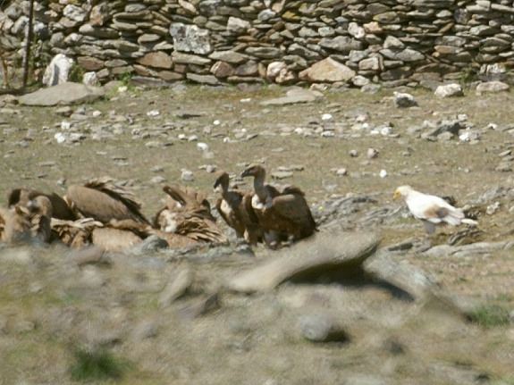 Gänsegeiern an einem Schafskadaver genähert hat. Spanischer Name: