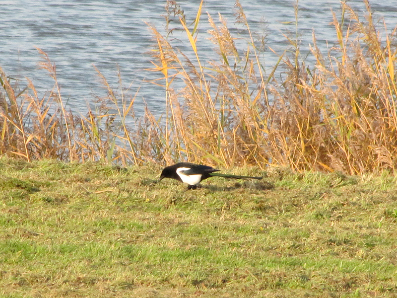 die Schultern sind weiß. Typisch für die Elstern ist der lange, schwarze