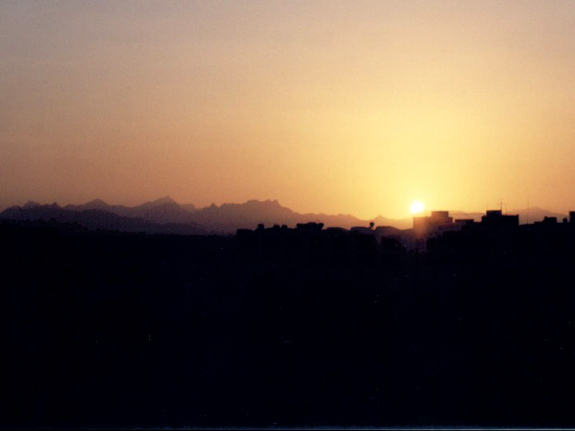 Direkt jenseits der Hauptstraße liegt die Wüste und im Dunst kann man am Horizont mehr oder weniger gut eine schroffe Bergkette erkennen. Diese wirkt im warmen Licht der Abendsonne besonders schön, da die Sonne allabendlich hinter ihr verschwindet. Am Tage sieht man die Berge hingegen meist kaum. Wer zudem genau hinschaut, kann in der Wüste tatsächlich Tiere entdecken. Neben Insekten und einigen anderen kleinen Tieren kommen dort auch vereinzelt Vögel vor.
