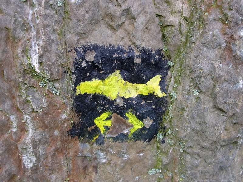 Fisch-Piktogramme, die auf Bäumen oder an anderen markanten Stellen