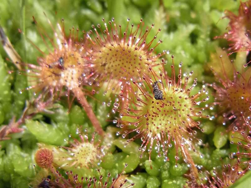 Rundblättrige Sonnentau (Drosera rotundifolia). Das Heidemoor