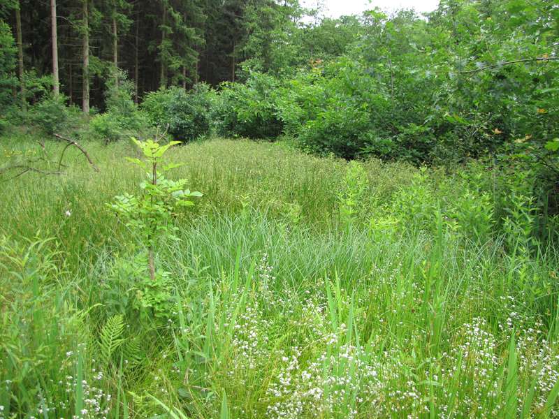 wenigen Metern und einer Wegbiegung zu einer Feuchtwiese am Waldrand,