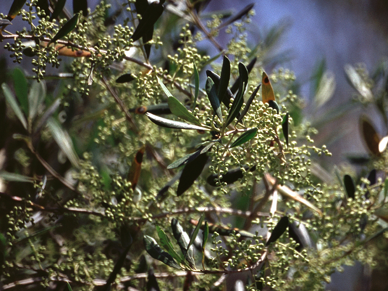 Mai und Juni, die kleinen Blüten sind weiß gefärbt. Ölbäume sind