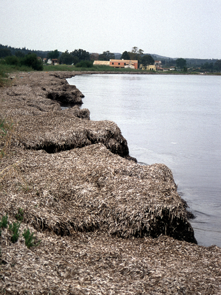 Schicht aus welken, abgestorbenen Seegrasstücken gelegen. Die Natur sich