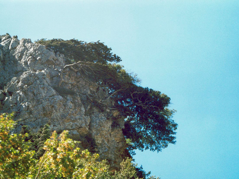 Platanen. Manche Bäume klammern sich mit ihren Wurzeln an steile Felsen,
