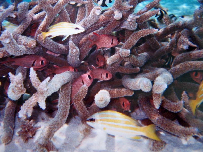 einige kleine Geweihkorallen. In der Nähe dieser Korallen haben sich an