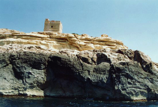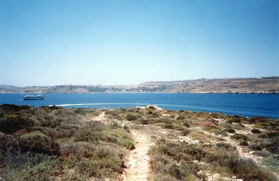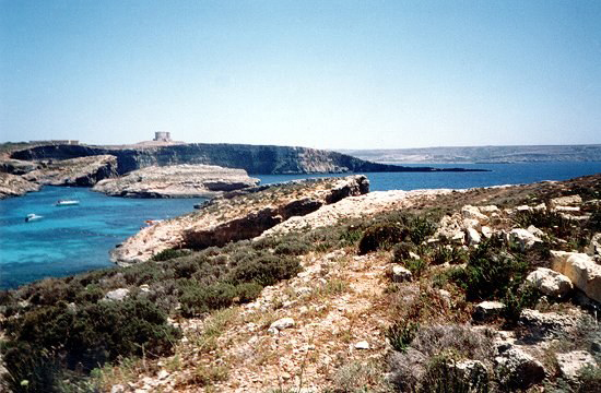 Aussicht auf Cominotto: Man sieht Comino mit dem Comino Tower, im Hintergrund ist Malta |