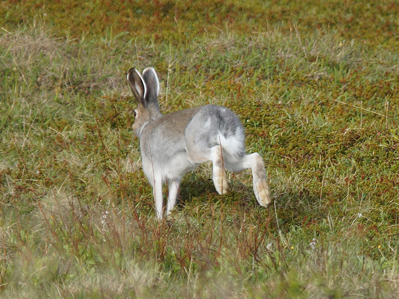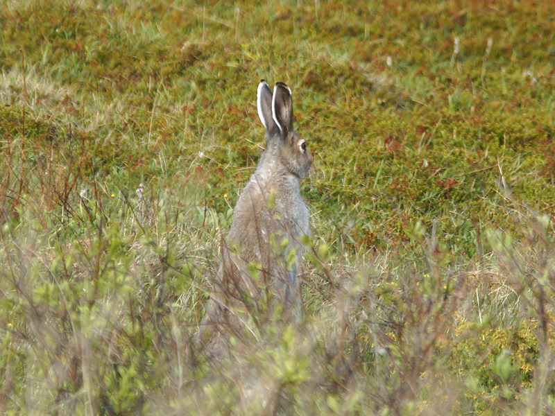 allerdings meist ein Fernglas oder Spektiv, weil Schneehasen gegenüber den Menschen