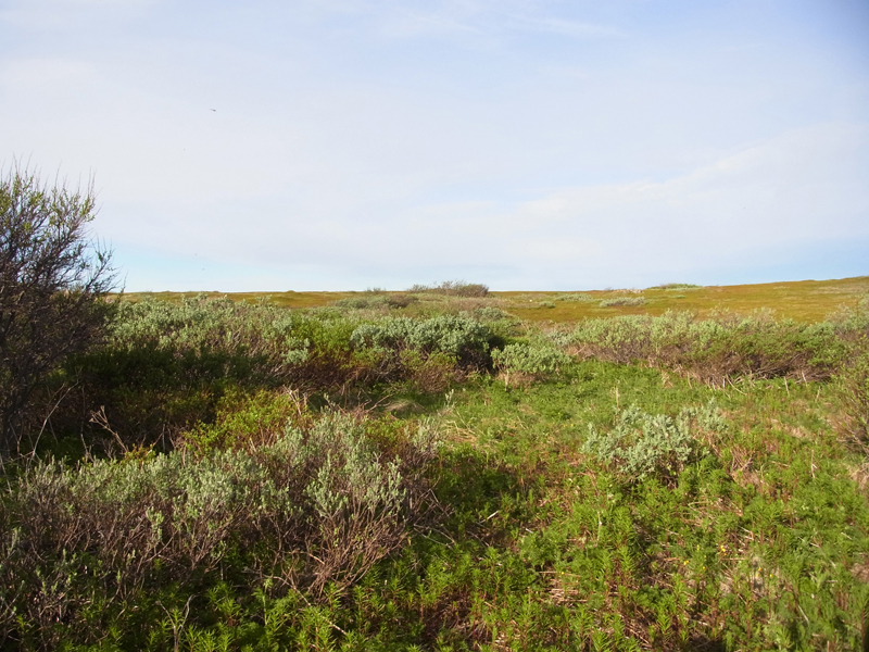 niedrigen Pflanzen auf, die auf weiten Teilen der Insel zu finden sind