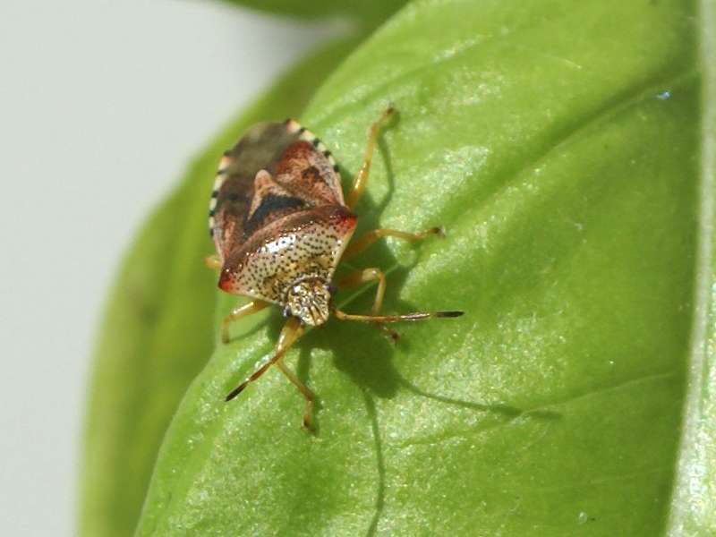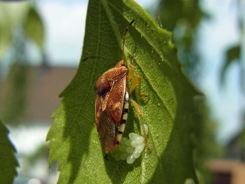 Vierfleck-Eichenwanze als Nahrung. Die Flugzeit dieser Wanzenart findet