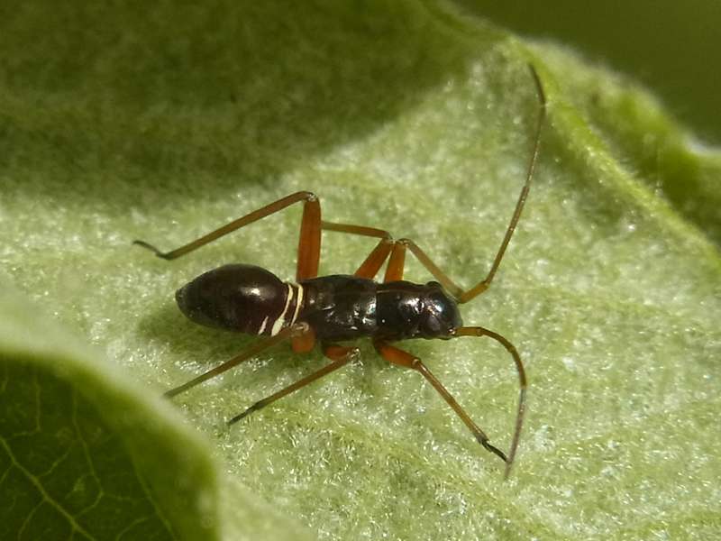 Ameisen nachahmt. Sie sind dunkel rotbraun gefärbt, haben rötliche Beine