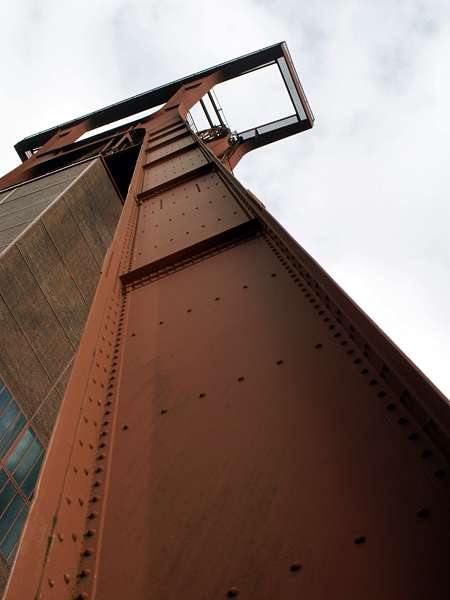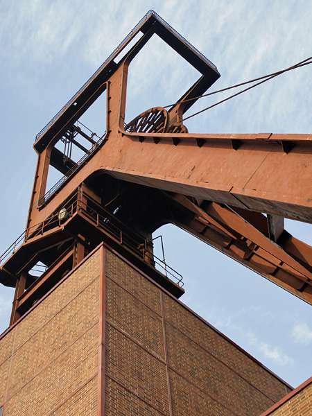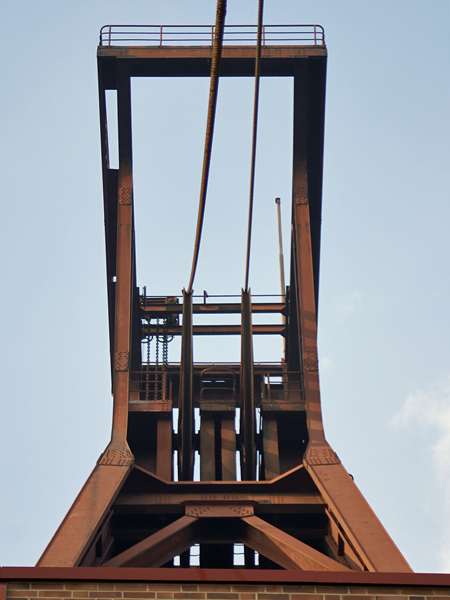 Fördergerüst von Schacht XII, siehe Foto rechts, mit seiner rotbraunen