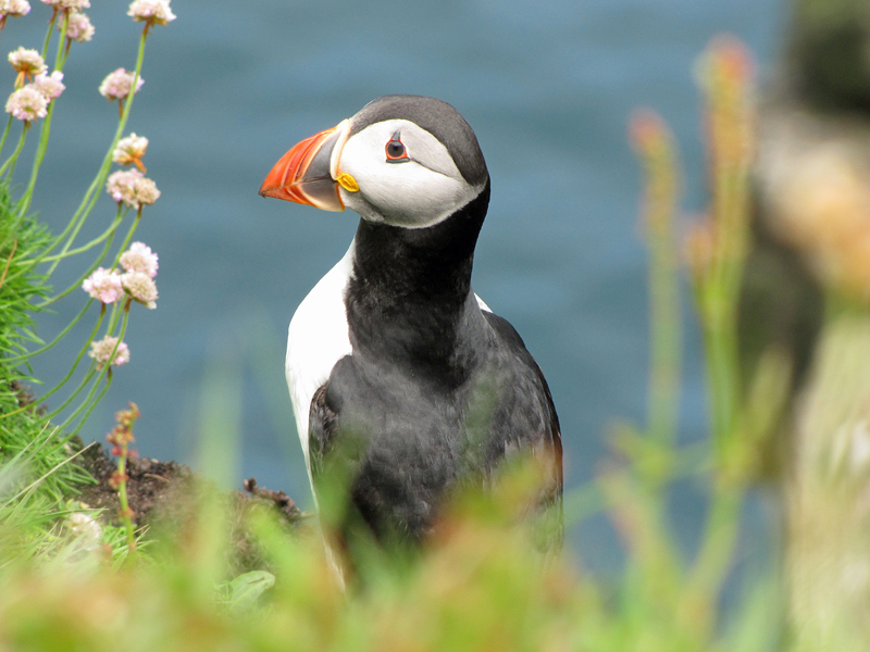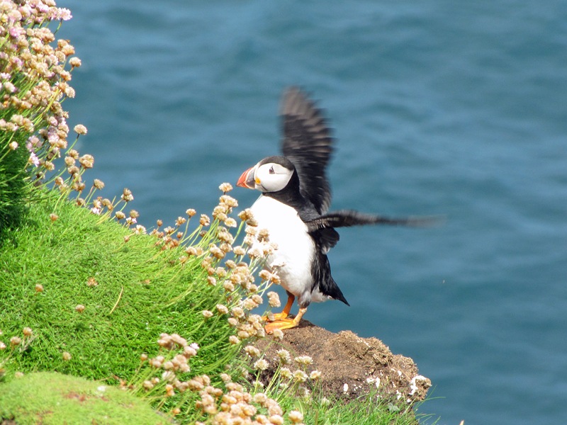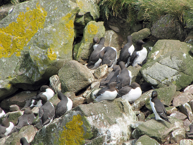 Seevögel, darunter Dreizehenmöwen, Papageitaucher und Tordalke.