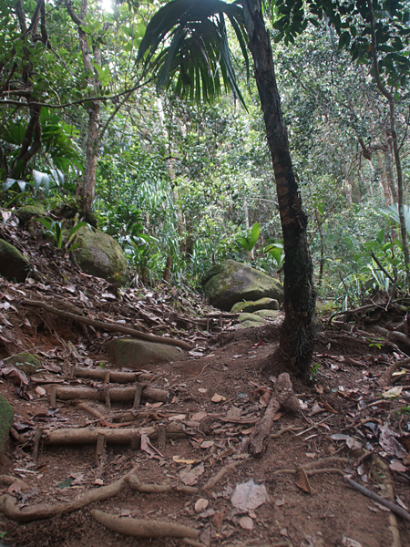 Der Weg zum Gipfel des Copolia führt an der Flanke des Berges empor und es gibt stellenweise improvisierte Stufen |