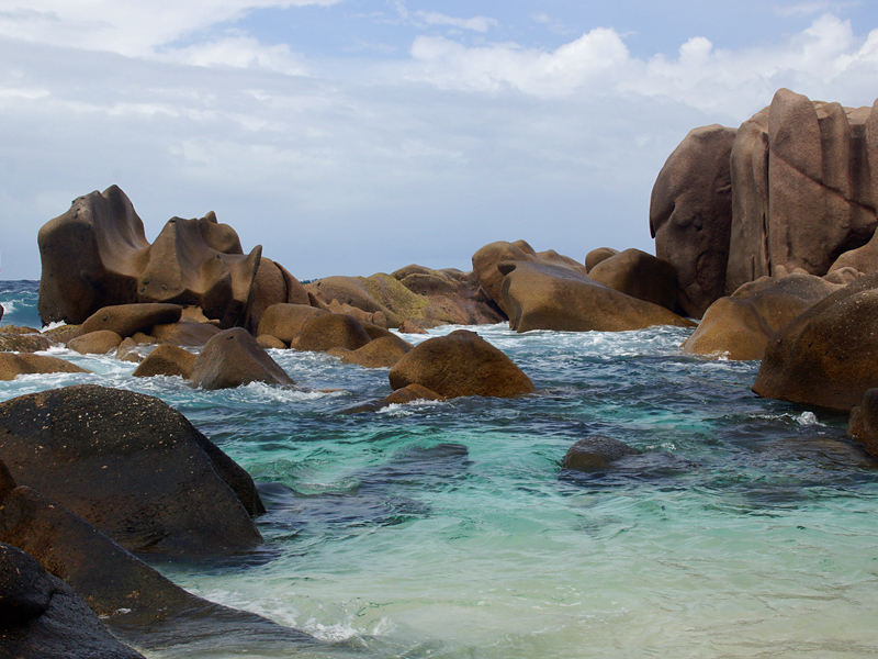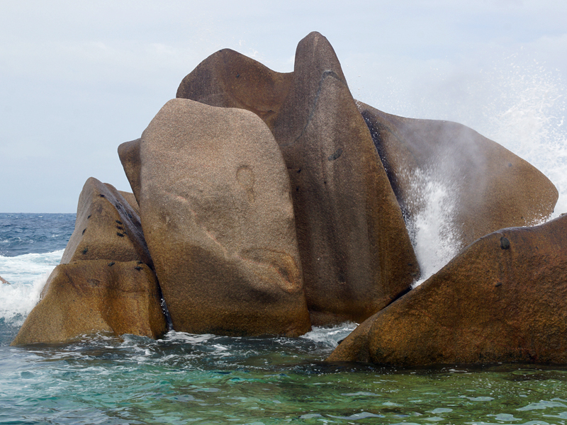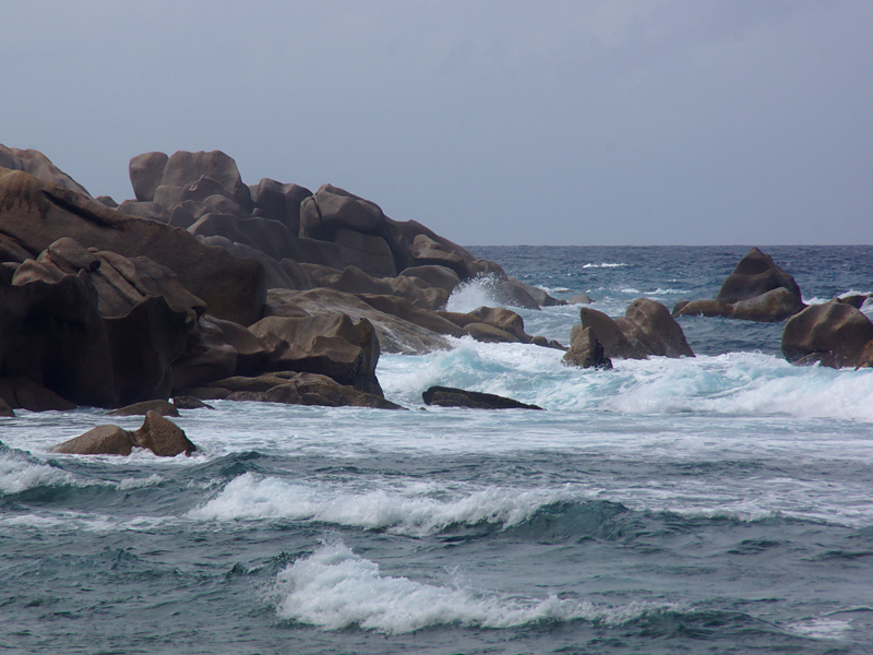 An manchen Tagen schlagen die Wellen hart gegen die Felsen der Anse Marron |