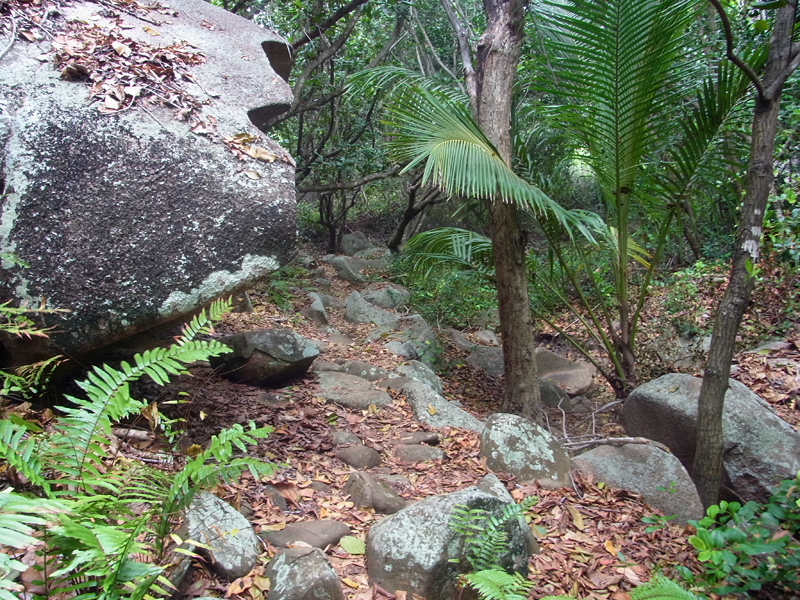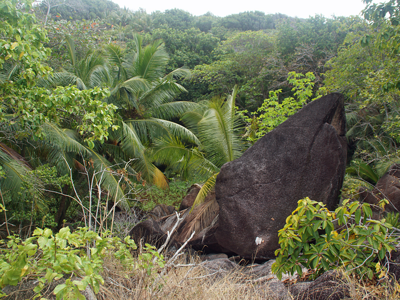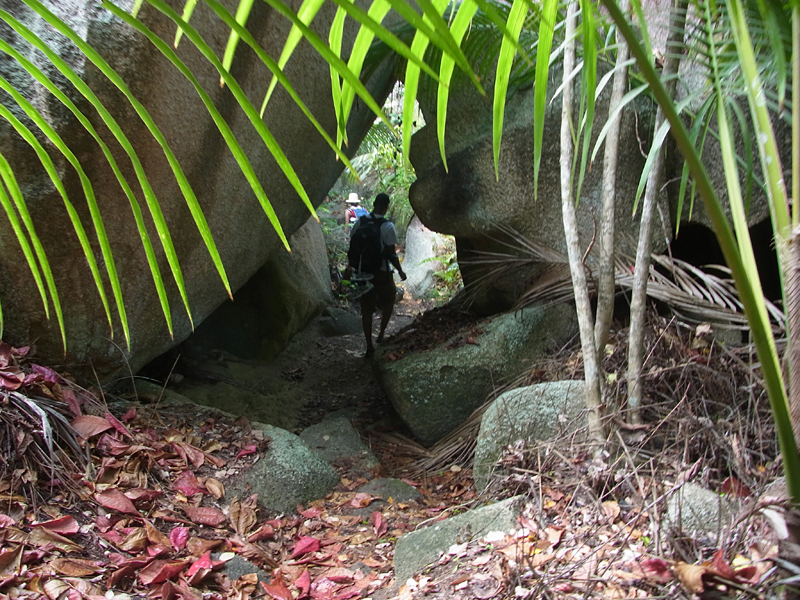 Der Weg von der Anse Bonnet Carré zur Anse Marron führt durch ein Waldstück mit Felsen |