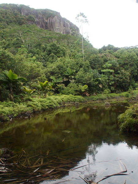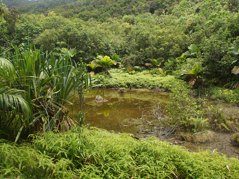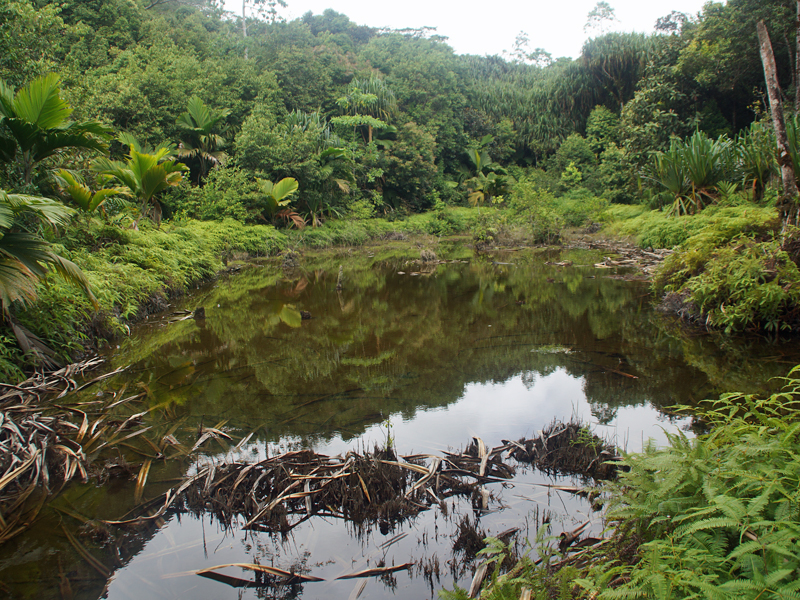 Lichtung im Urwald. An das Gewässer grenzt ein sumpfiger Bereich, der