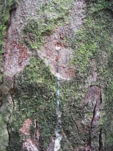 befestigt, in den der Naturkautschuk läuft. Ist der Baum etwa 25 Jahre