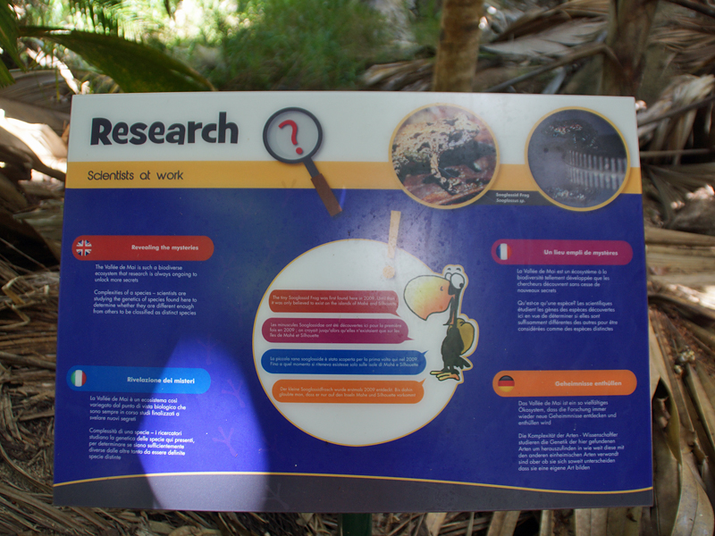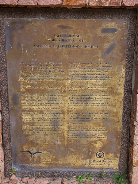 Diese Tafel im Eingangsbereich weist das Vallée de Mai als UNESCO-Welterbestätte aus