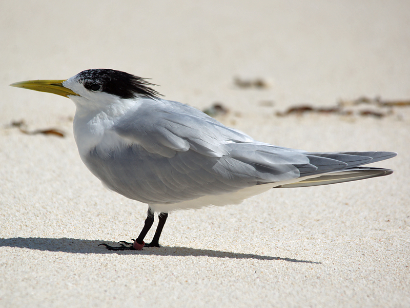 Der Schnabel und die Beine sowie die Füße sind gelb, die Iris ist