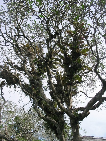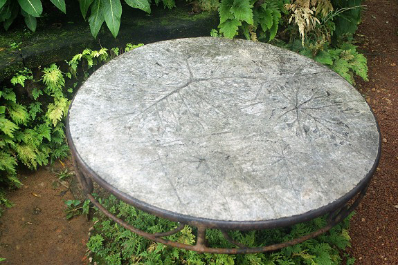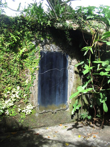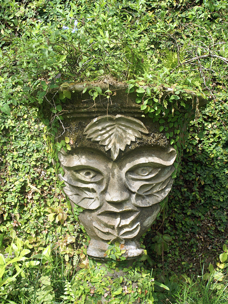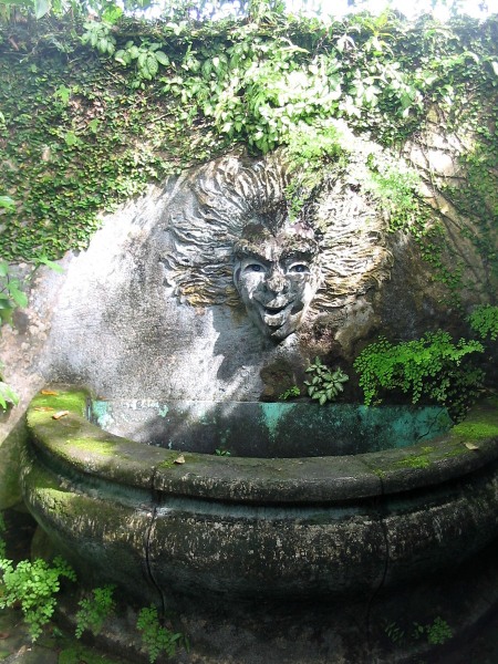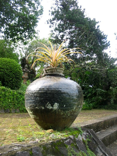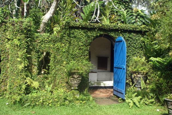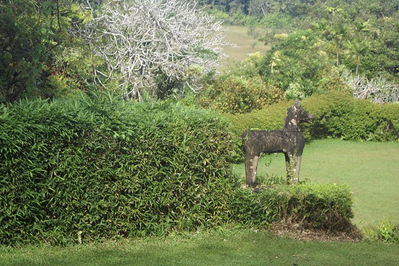 jeder Menge tropischer Pflanzen, zwischen denen Skulpturen aufgestellt