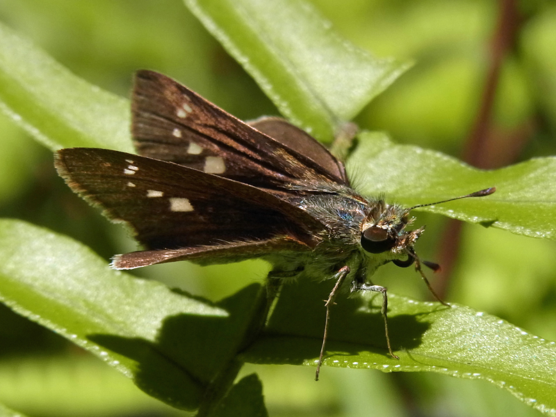 Flügeloberseiten dunkelbraun und weiß gemustert, an der Basis sind sie
