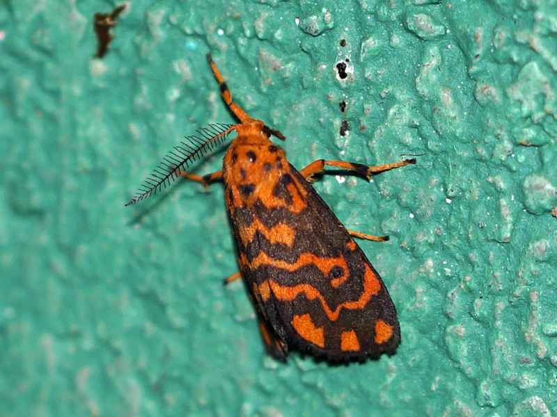 Männchen haben doppelt gekämmte Fühler, die ebenfalls schwarz und an der