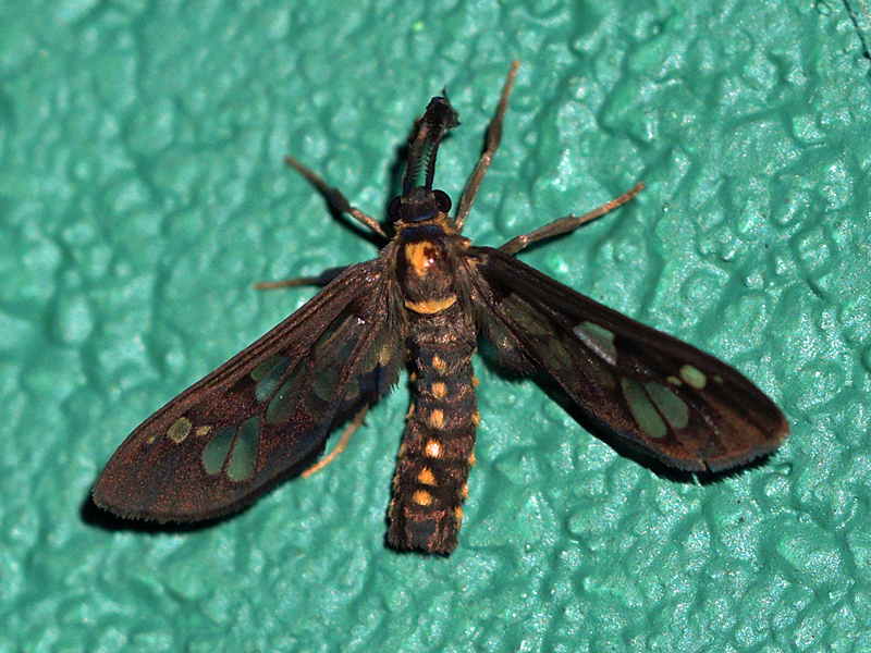 Flügel sind schwarz und haben einige Flecken, die keine Schuppen tragen