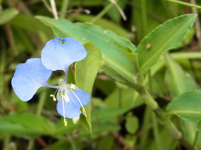 die leicht oval geformt sind. Die gelben Staubgefäße stehen zu dem Blau