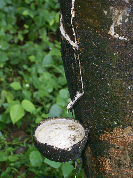 die Produktion des milchigen Saftes einstellt. Plantagenbäume werden dann gefällt und