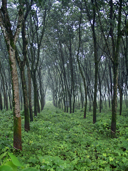 Kautschukbäume auf großen Plantagen angebaut und es gibt sogar ein