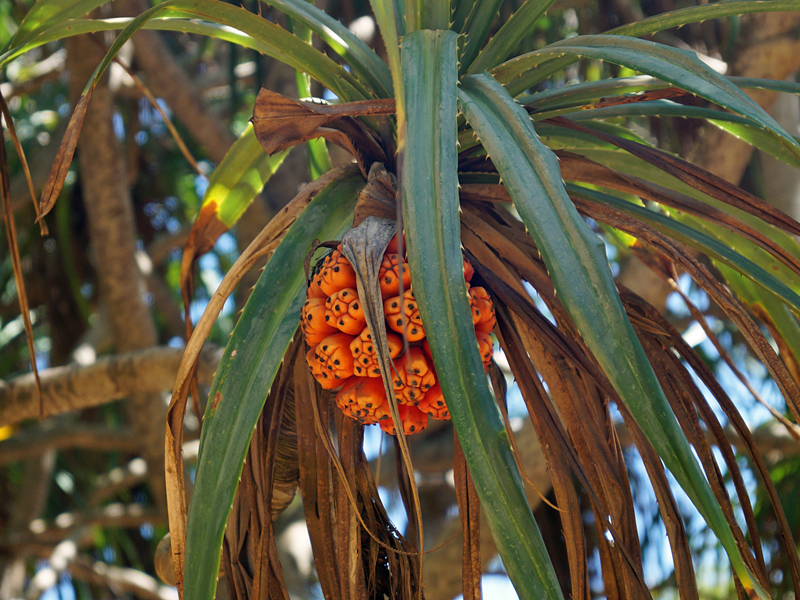 sogar gegessen. Die Früchte des Schraubenbaums sind orangerot gefärbt,